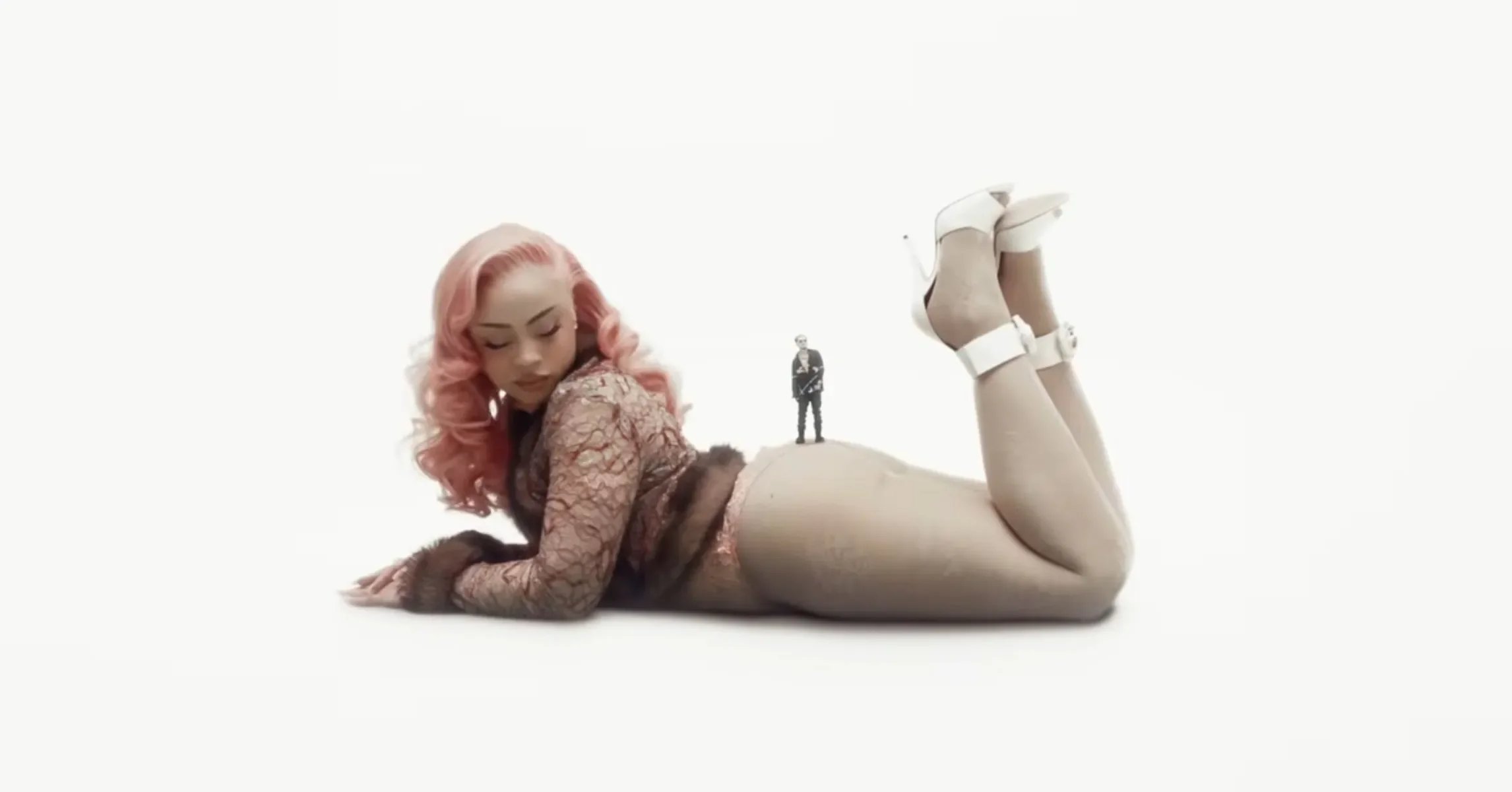 What gives the video its immediate high-fashion impact is Ice Spice. Her look was reported by Complex as all Valentino FW26, a styling choice that instantly lifts the visual out of standard music-video territory and into something closer to a campaign image. Against the clean, surreal set, the Valentino reads with even more force: polished, dominant, and unapologetically glamorous.